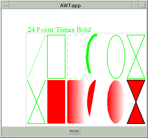 int X = (int)this.getLocation().getX(); int Y = (int)this.getLocation().getY(); static class MyButton extends Button implements Printable { public MyButton() { super("MyButton"); } public void paint(Graphics g) { System.out.println("mybutton paint"); //To see the label text, you must specify a font for //the printer graphics context Font f = new Font("Monospaced",Font.PLAIN,12); System.out.println (f); g2.setFONT (f); //Using "g" render anything you want. //Get the button's location, width, and height int X = (int)this.getLocation().getX(); int Y = (int)this.getLocation().getY(); int W = (int)this.getSize().getWidth(); int H = (int)this.getSize().getHeight(); //Draw the button shape g.drawRect(X, Y, W, H); //Draw the button label //For simplicity code to center the label inside the //button shape is replaced by integer offset values g.drawString(this.getLabel(), X+10, Y+15); } public int print( Graphics g, PageFormat pf, int pi) throws PrinterException { System.out.println("mybutton print"); if (pi >= 1) { return Printable.NO_SUCH_PAGE; } Graphics2D g2 = (Graphics2D) g; //To see the button on the printed page, you //must translate the printer graphics context //into the imageable area g2.translate(pf.getImageableX( ), pf.getImageableY()); paint(g2); return Printable.PAGE_EXISTS; }